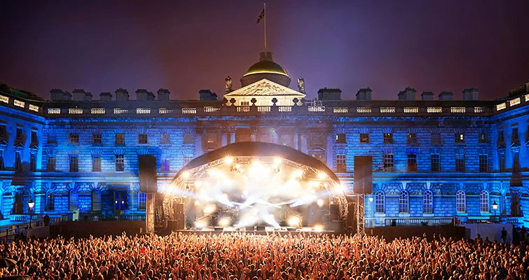 On the day of the event, the air was stagnant and humid, the sky overcast, and London seemed too crowded: as we navigated our way through Soho to Somerset House, I felt vaguely faint, dazed by the mercurial movement of an amorphous crowd, seizing Lara’s hand as she confidently glided through the streets. I hadn’t been to Somerset House before, and to me it seemed majestic—a glorious and ornate neoclassical monument. Somehow it also seemed dormant, its pale grey stones lukewarm, the courtyard’s air motionless in its enclosure between the surrounding buildings. The limited number of tickets meant that the cobbled yard was filled not with raucous rumble of an agitated crowd but with soft voices, conversations merging into a faint hum that ebbed and flowed as we made our way closer to the stage.